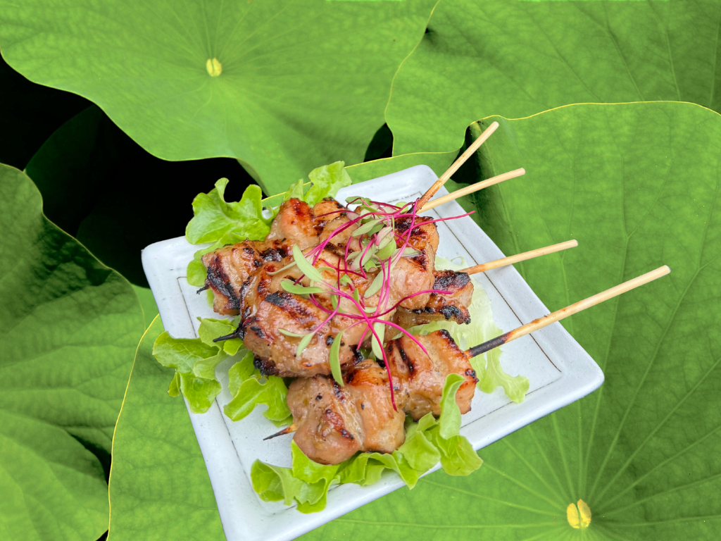 Marinated pork belly skewers, char-grilled, served with nam jim jaew (mint, coriander, lime, chilli)